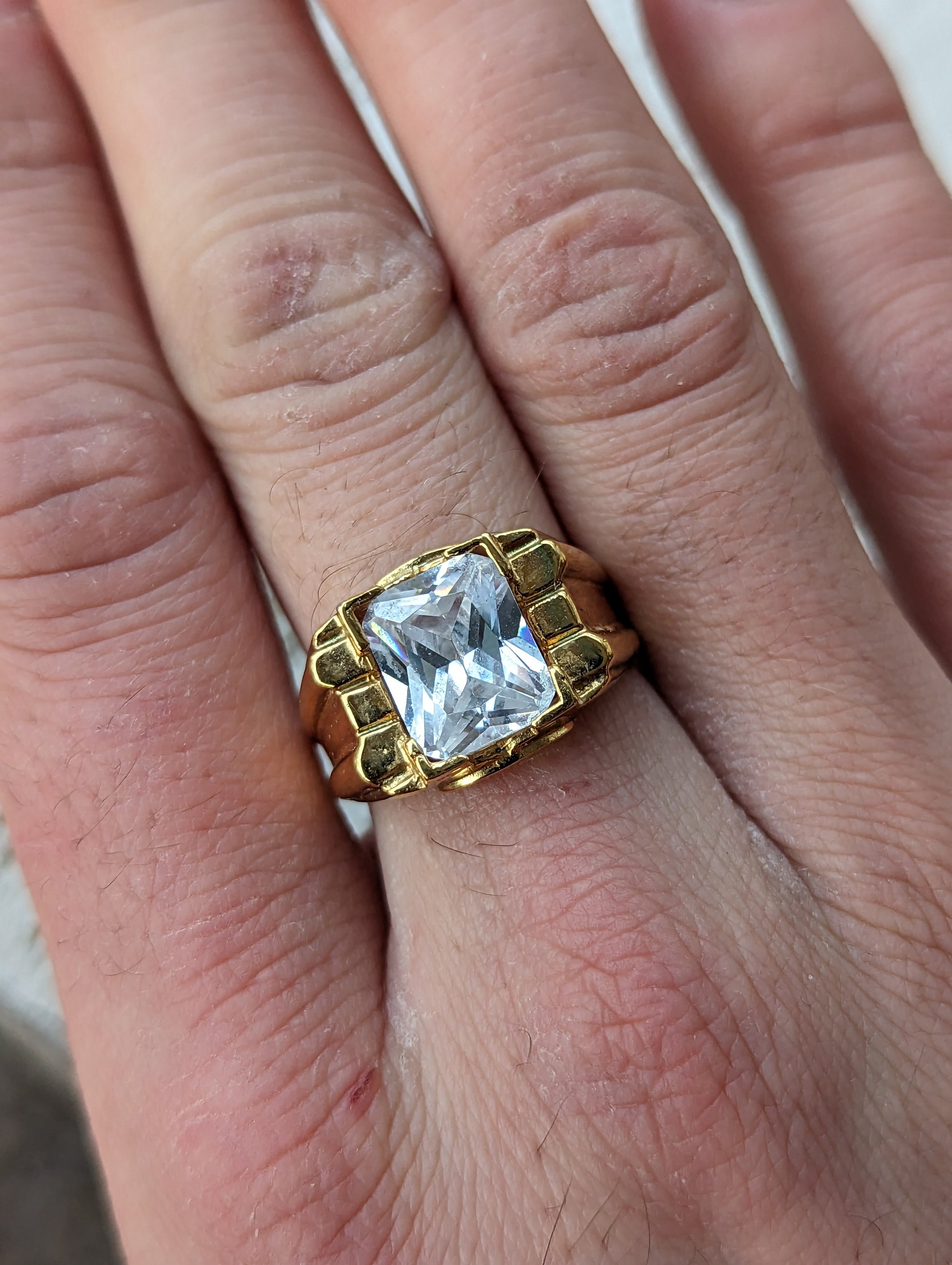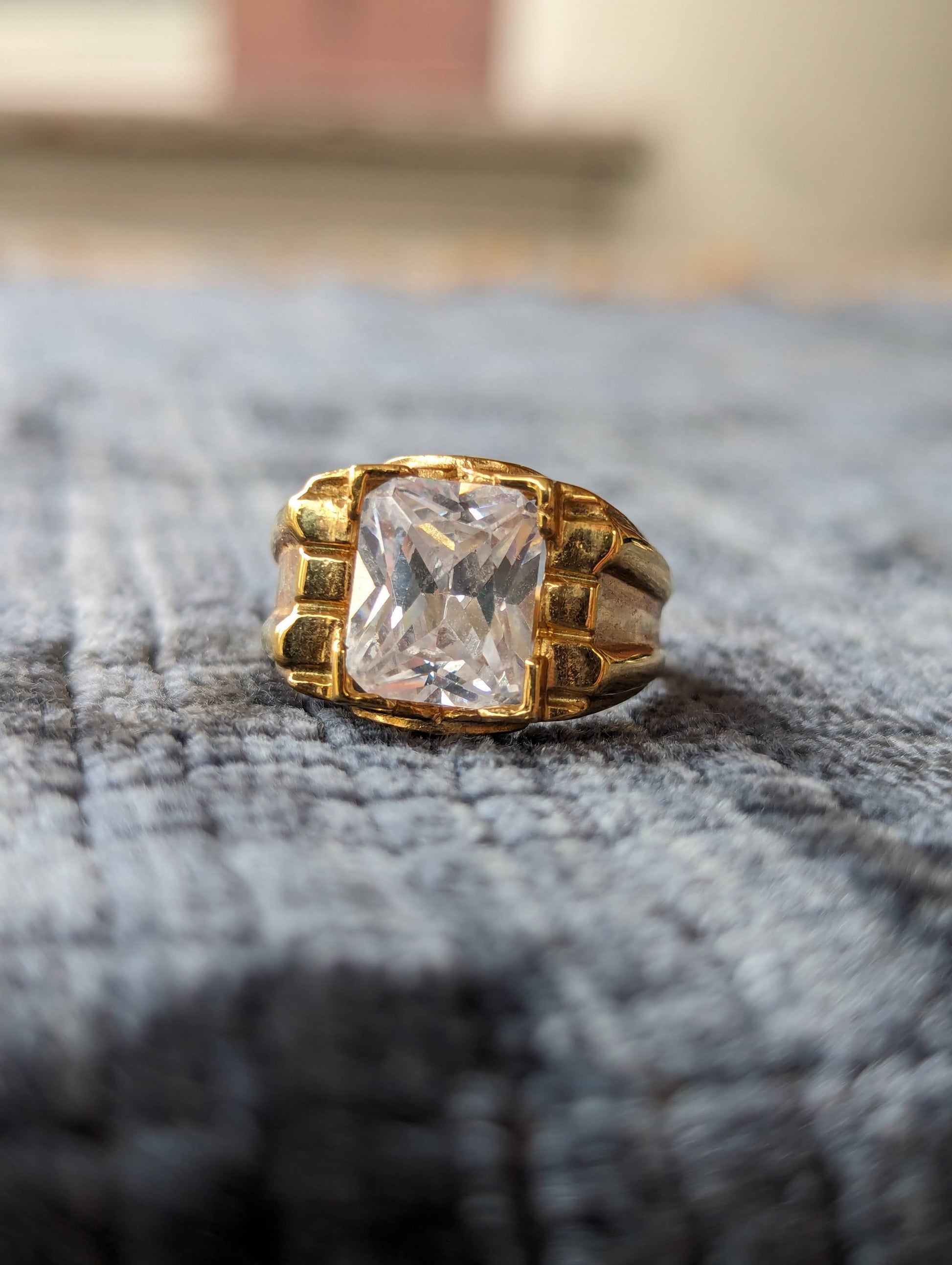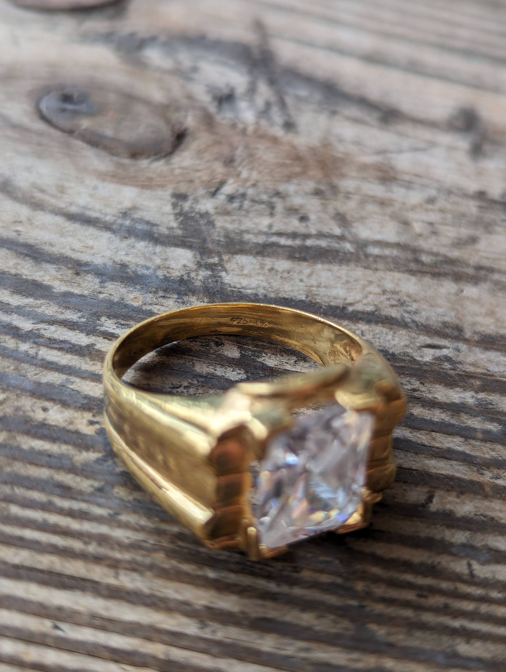 Deco style 18k on Sterling emerald cut CZ signet ring