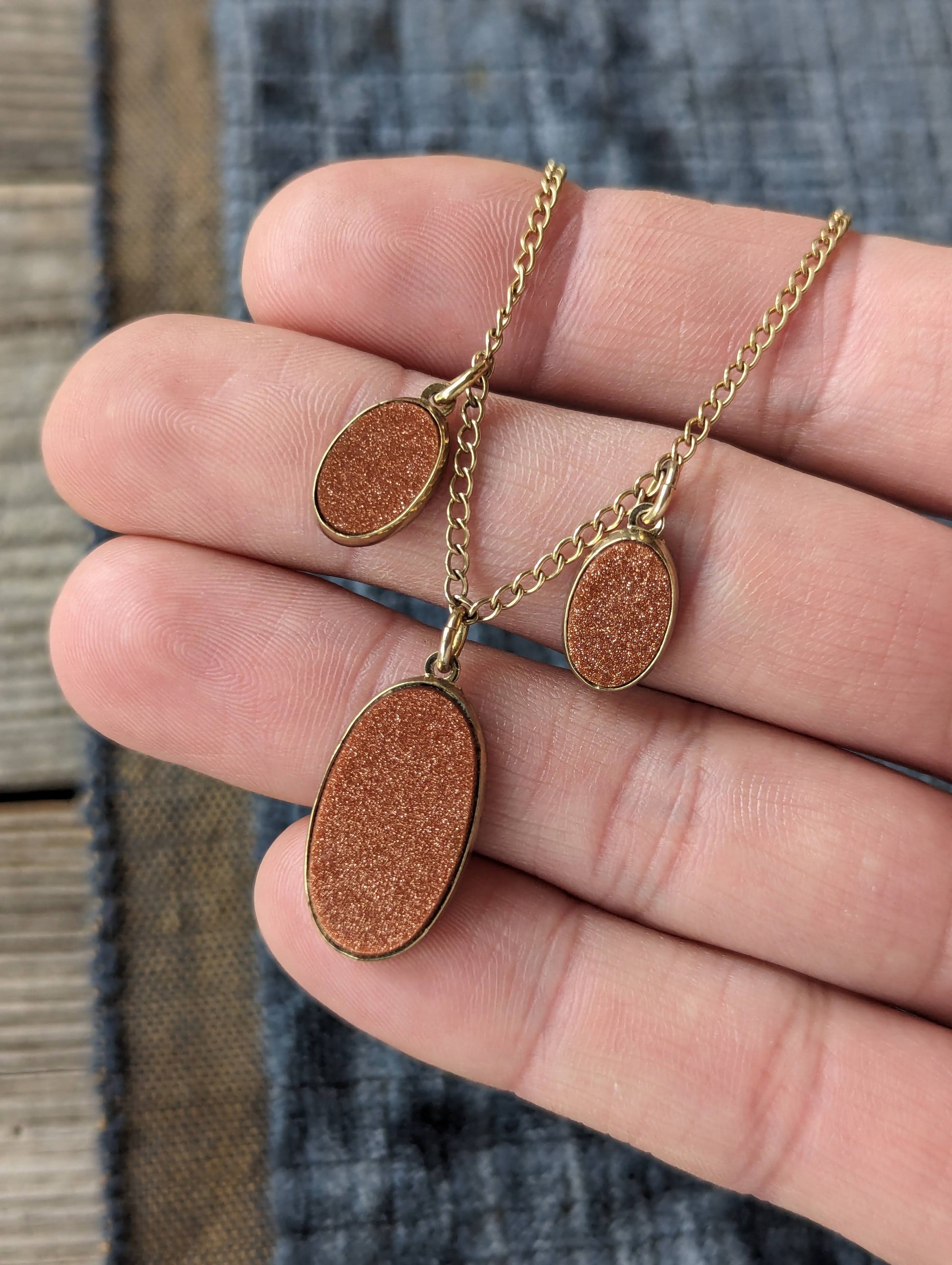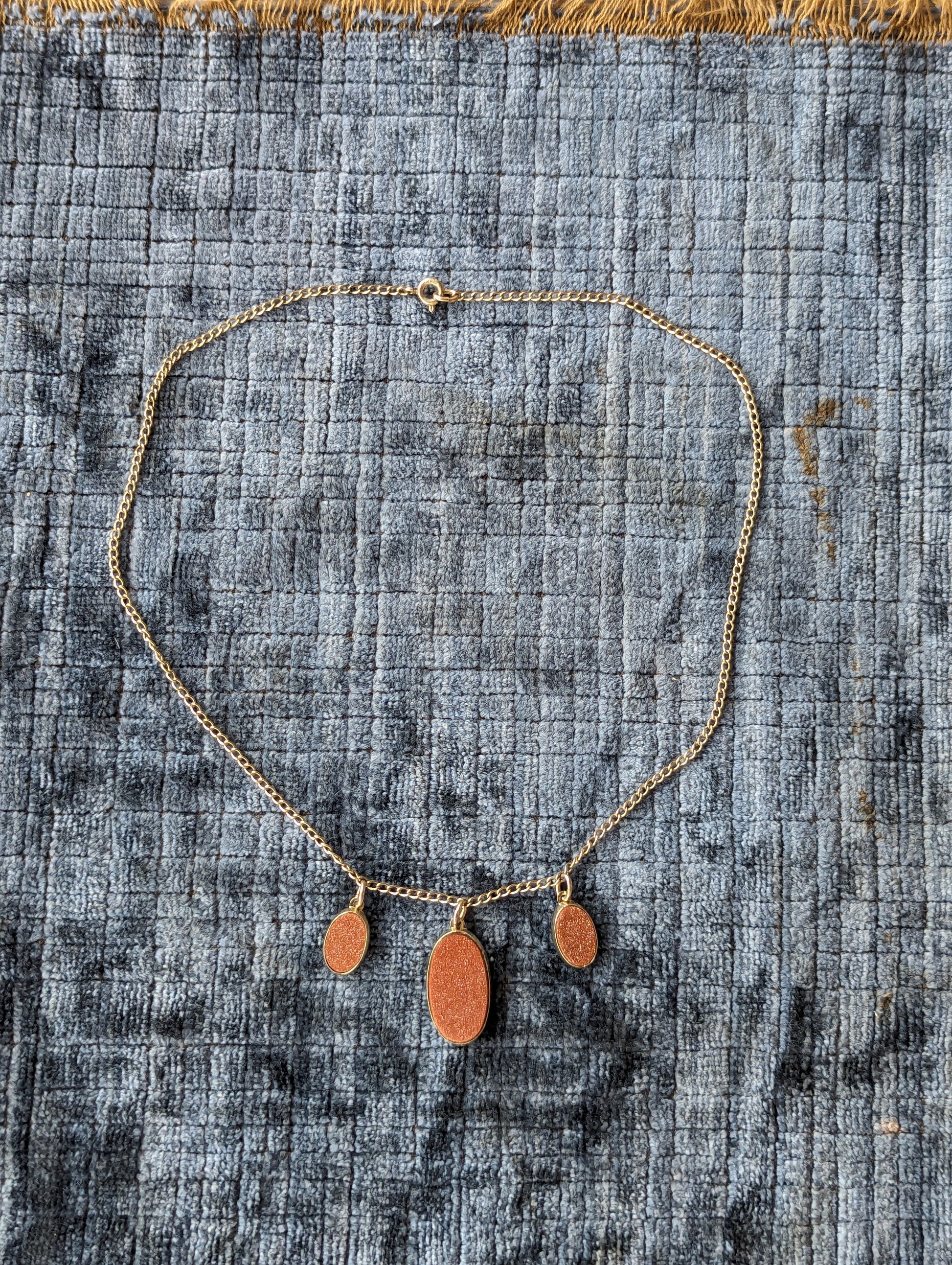Beautiful 1930s gold filled & dazzling Goldstone 3-drop necklace! Shimmering polished stones all in great condition!