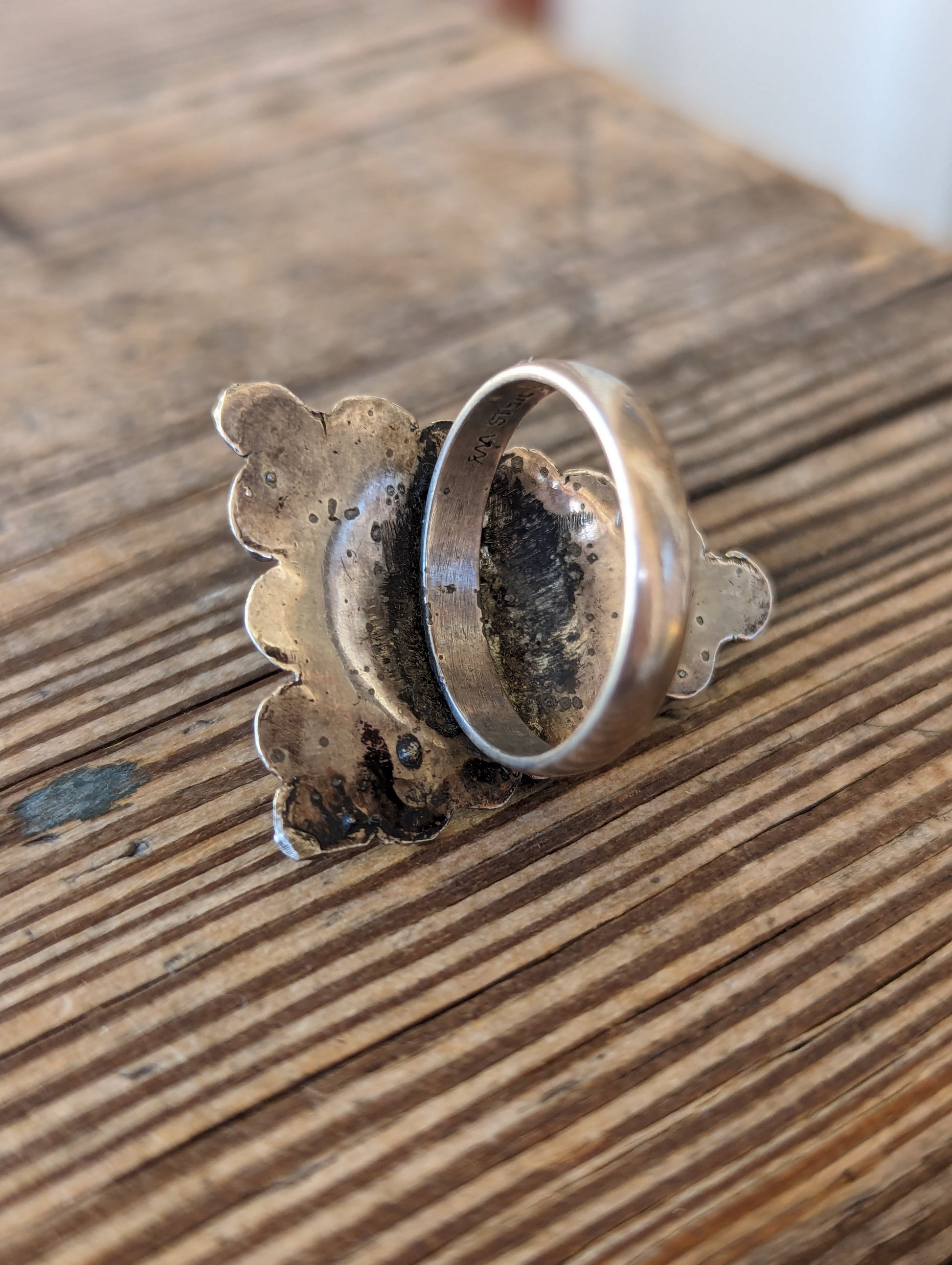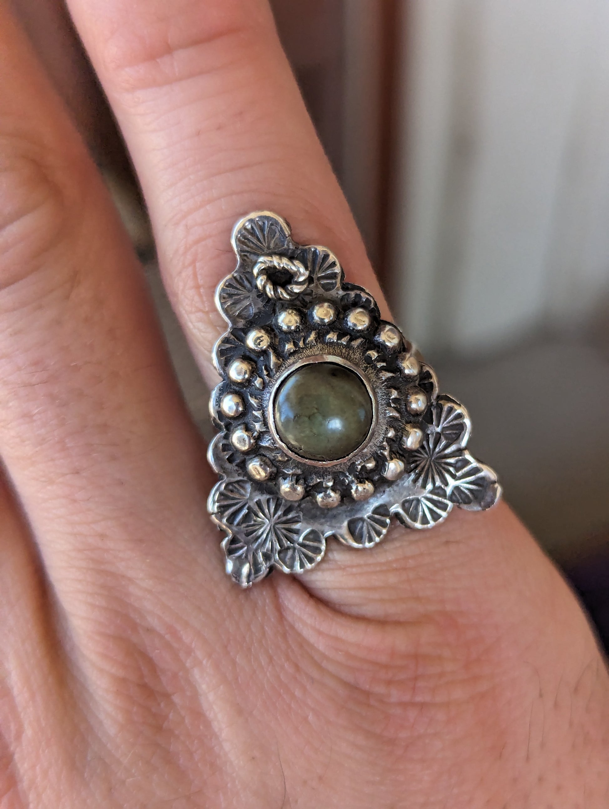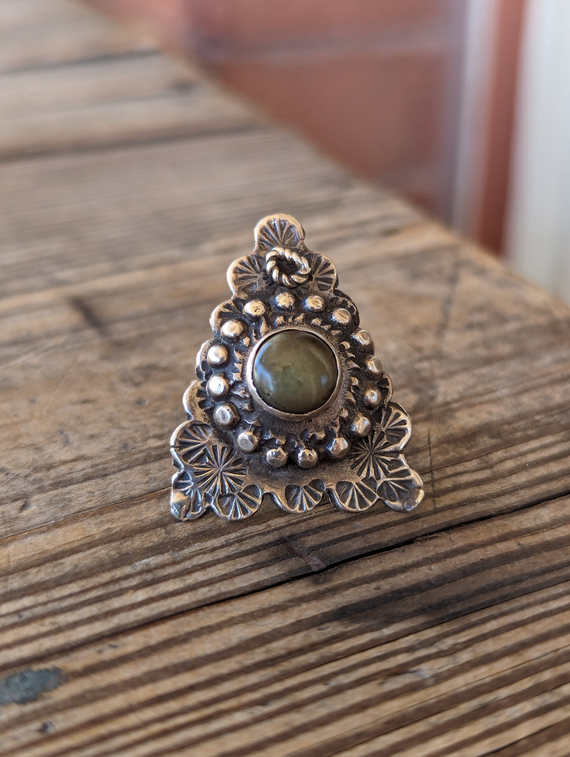 This piece is an old "marriage" of a 60s/70s Wheeler sterling band, and a 1930s-40s Mexican made solid sterling & green onyx plaque! Gorgeous hand stamped design reminiscent of the planchette used on a Ouija board. Not sure what the applied piece was originally, possibly a panel from a collar necklace? Super unique!