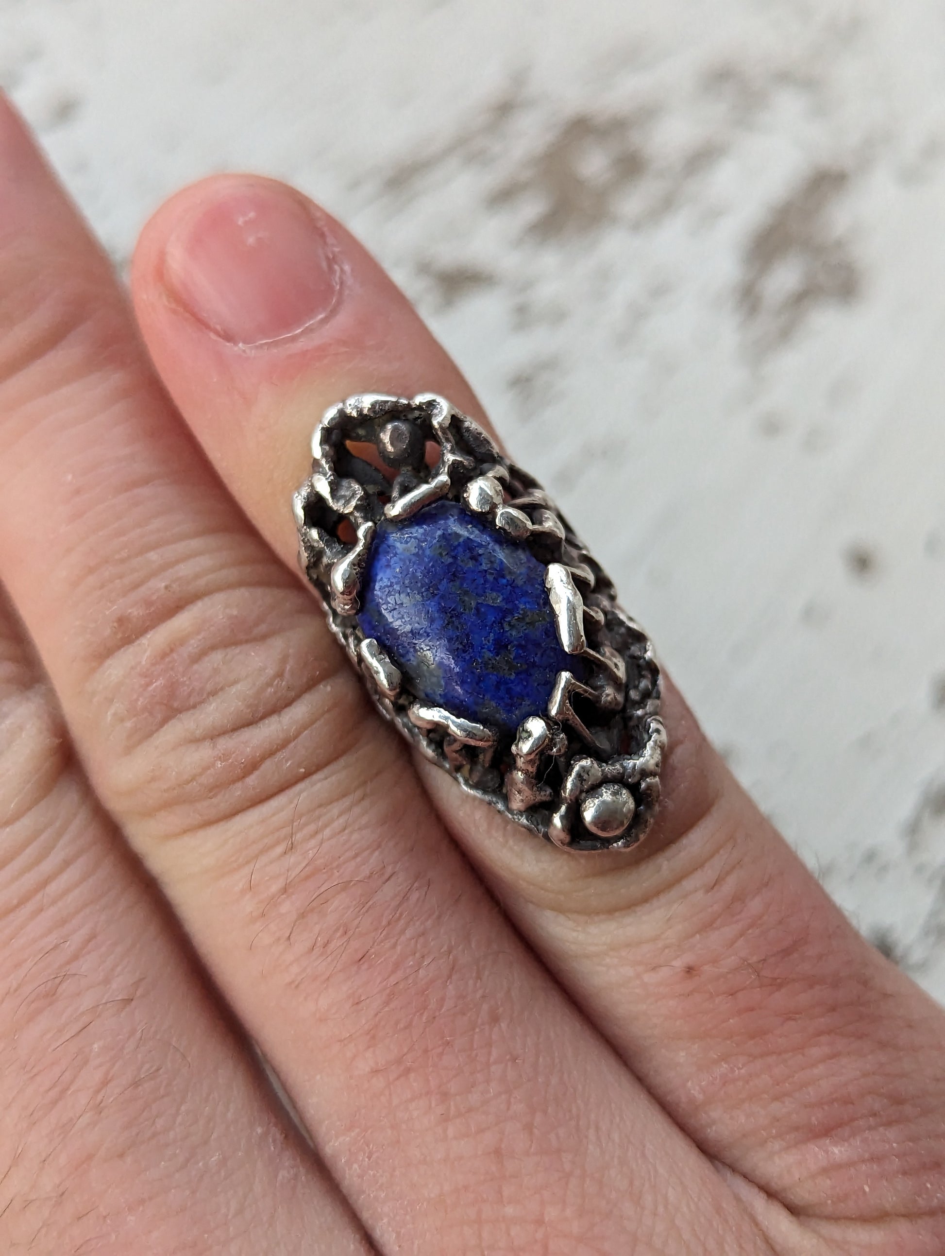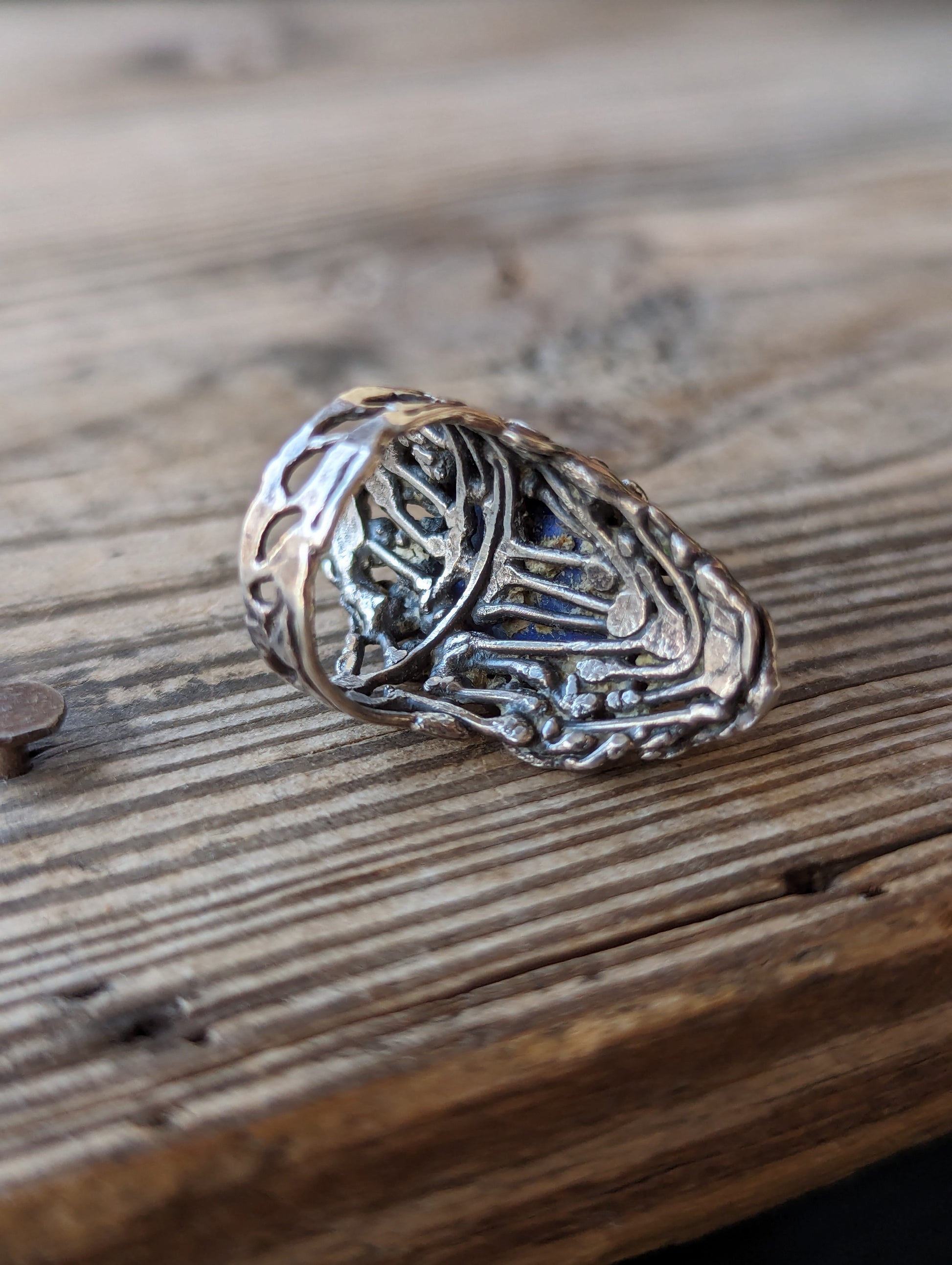70s artist made solid cast sterling & lapis Brutalist ring