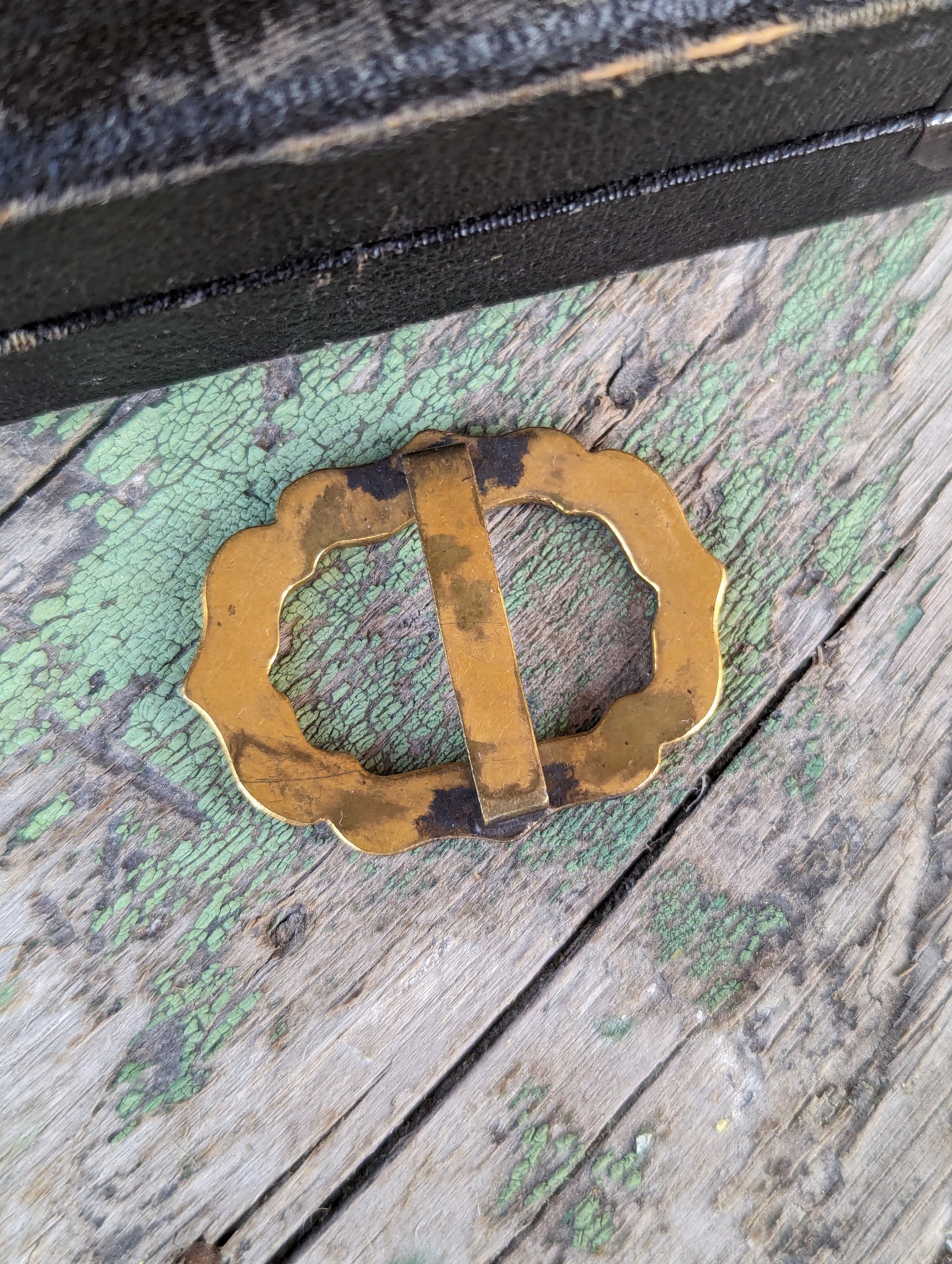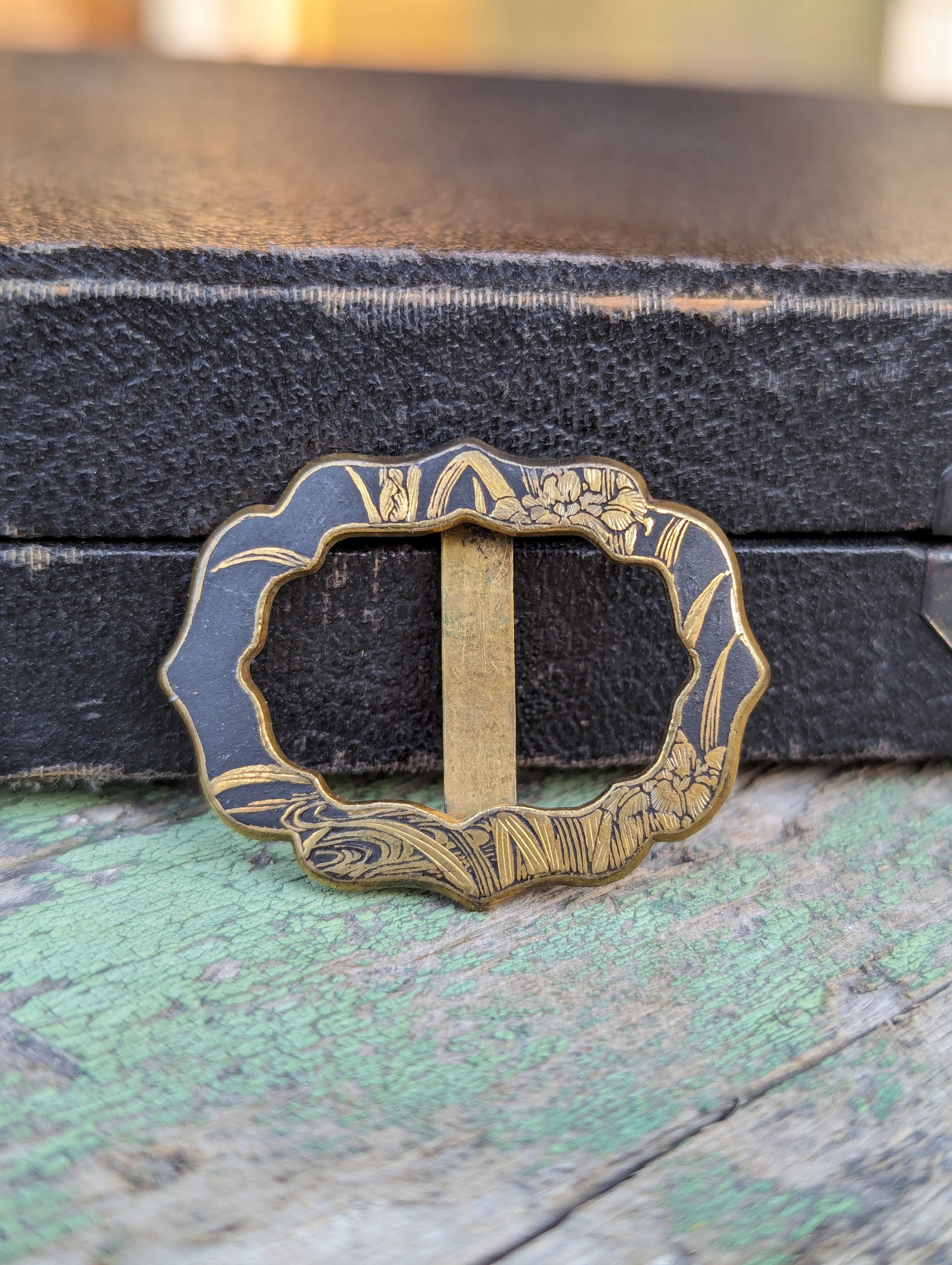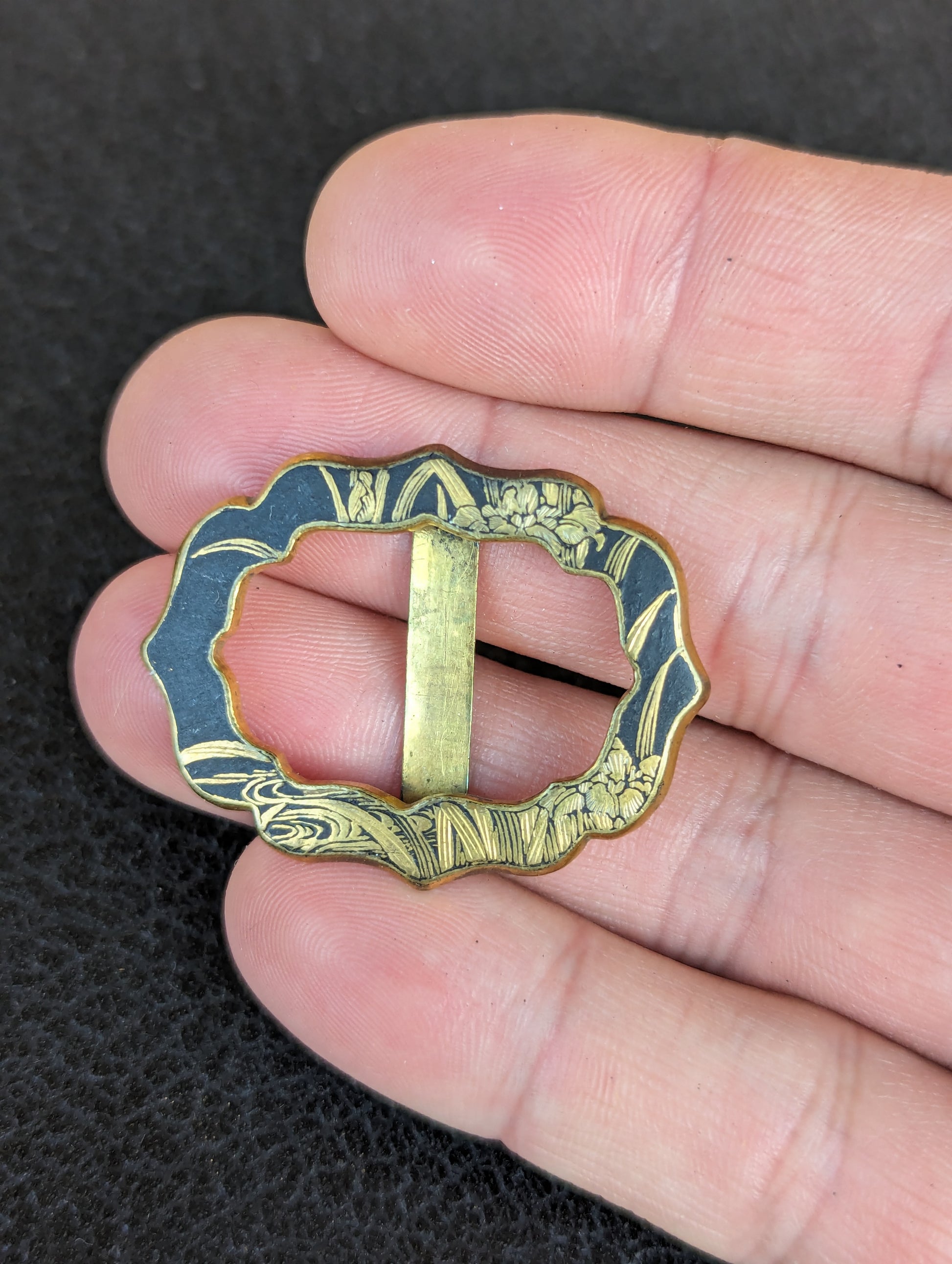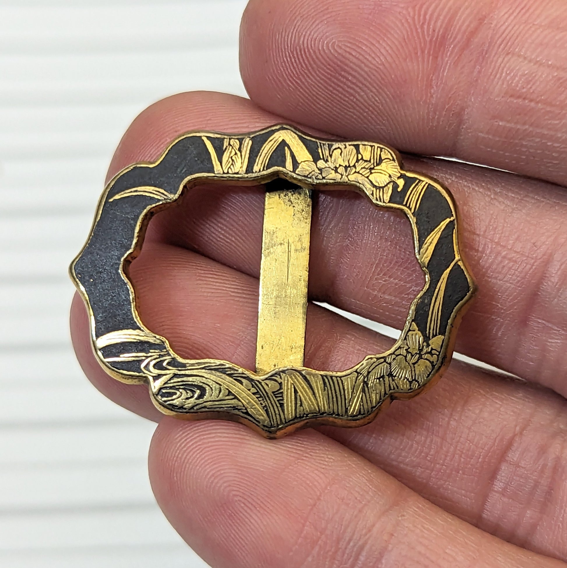 Stunning antique Japanese made gilt brass & Damascene sash slide! Lovely hand engraved 24k design of what lookskme a pond's edge & lilies! Great patina. Would also make a beautiful slide for a velvet collar choker!