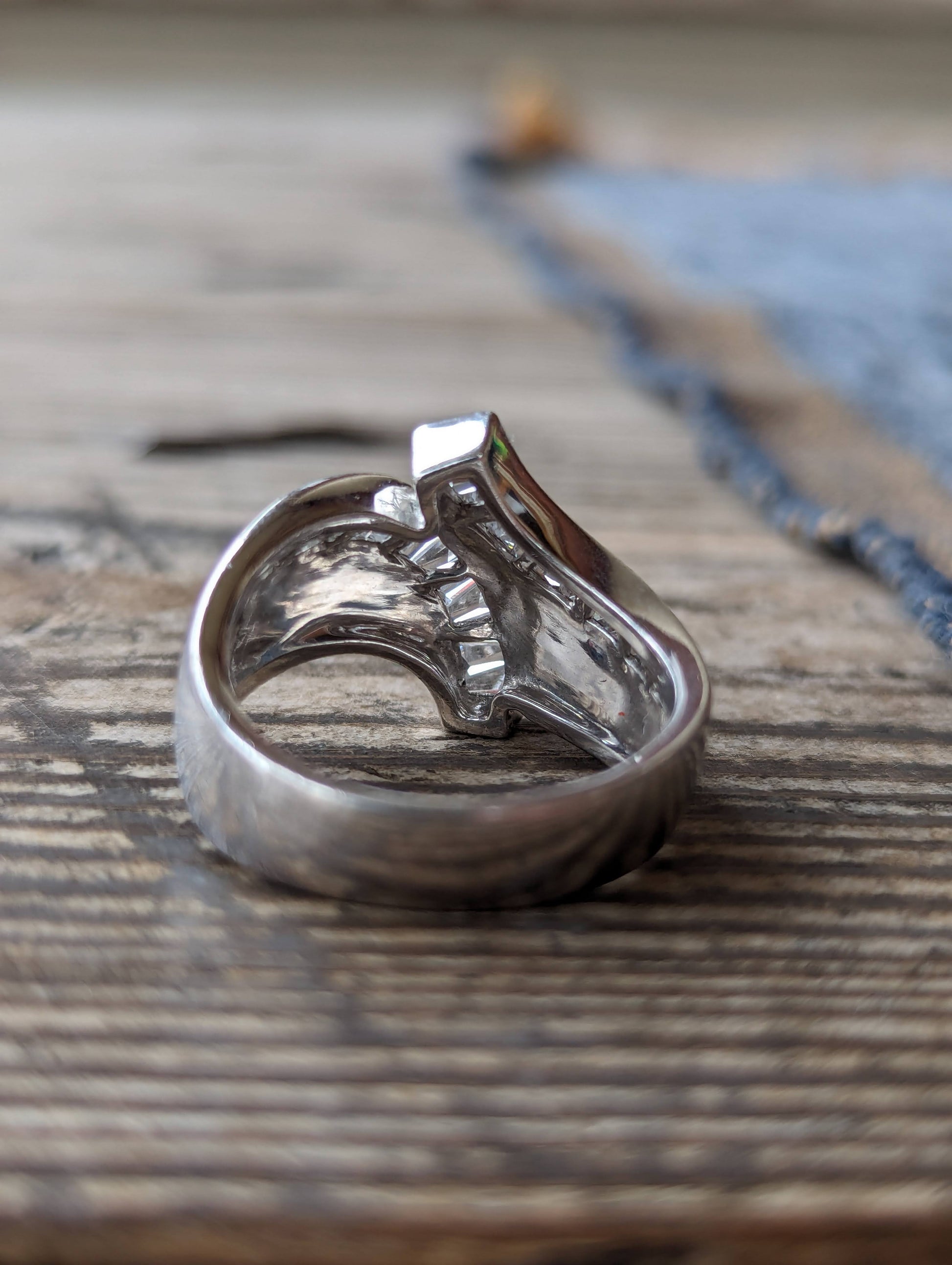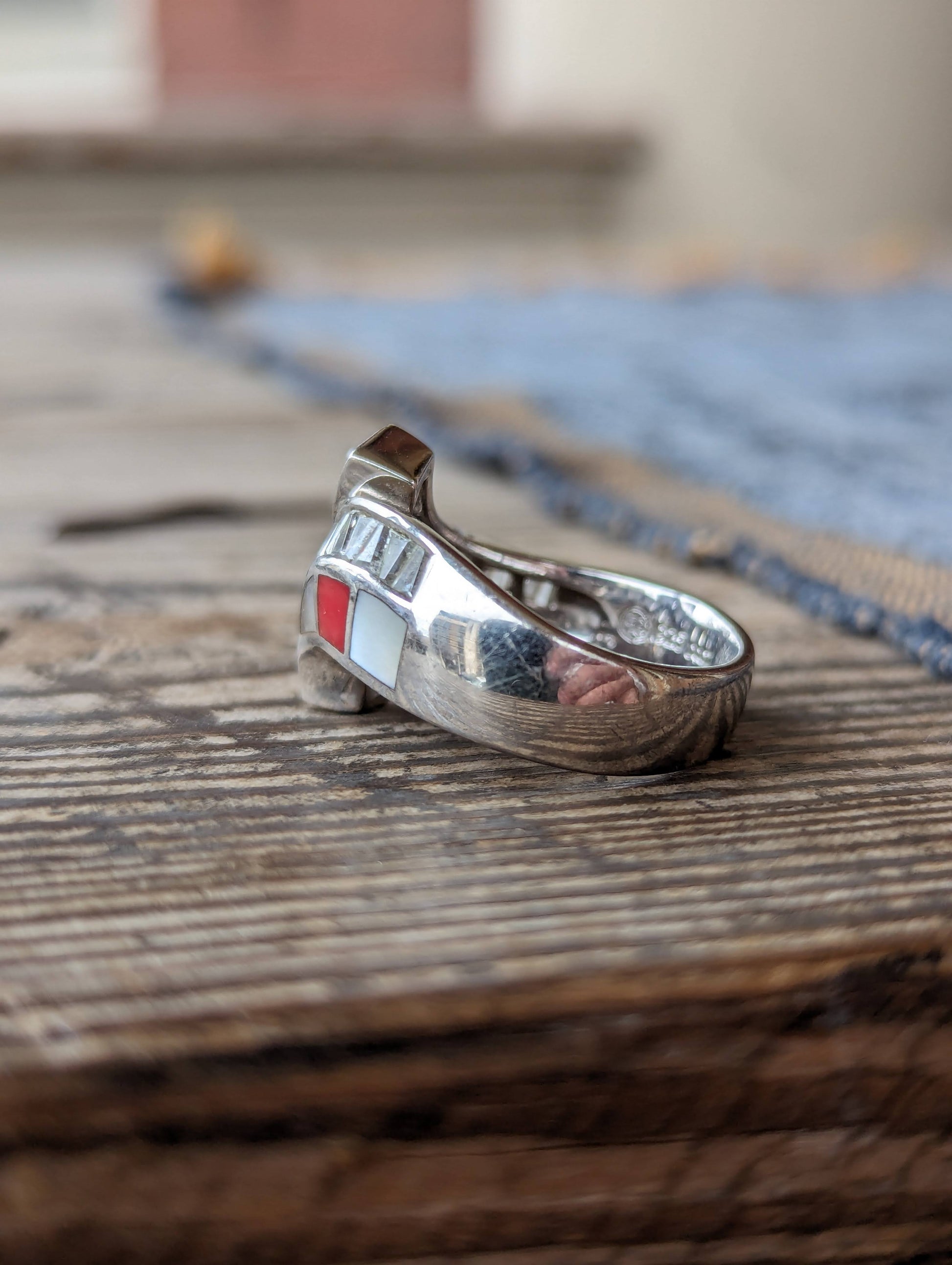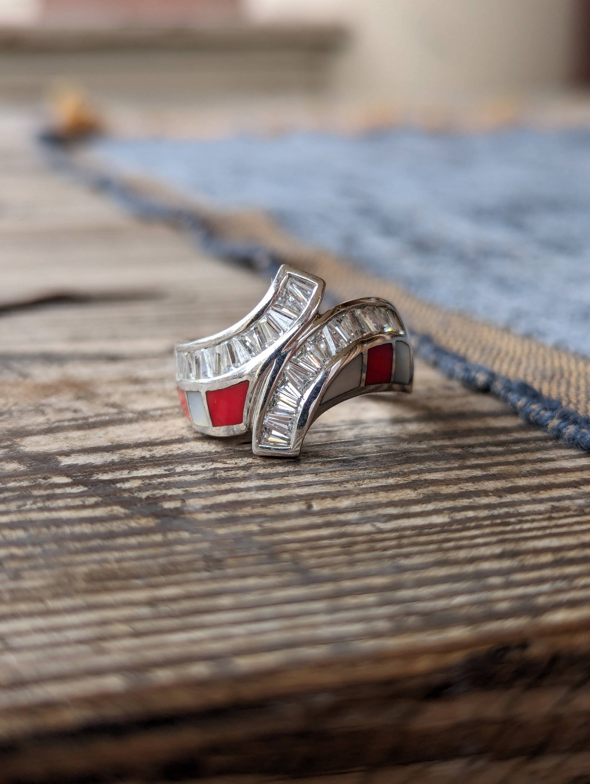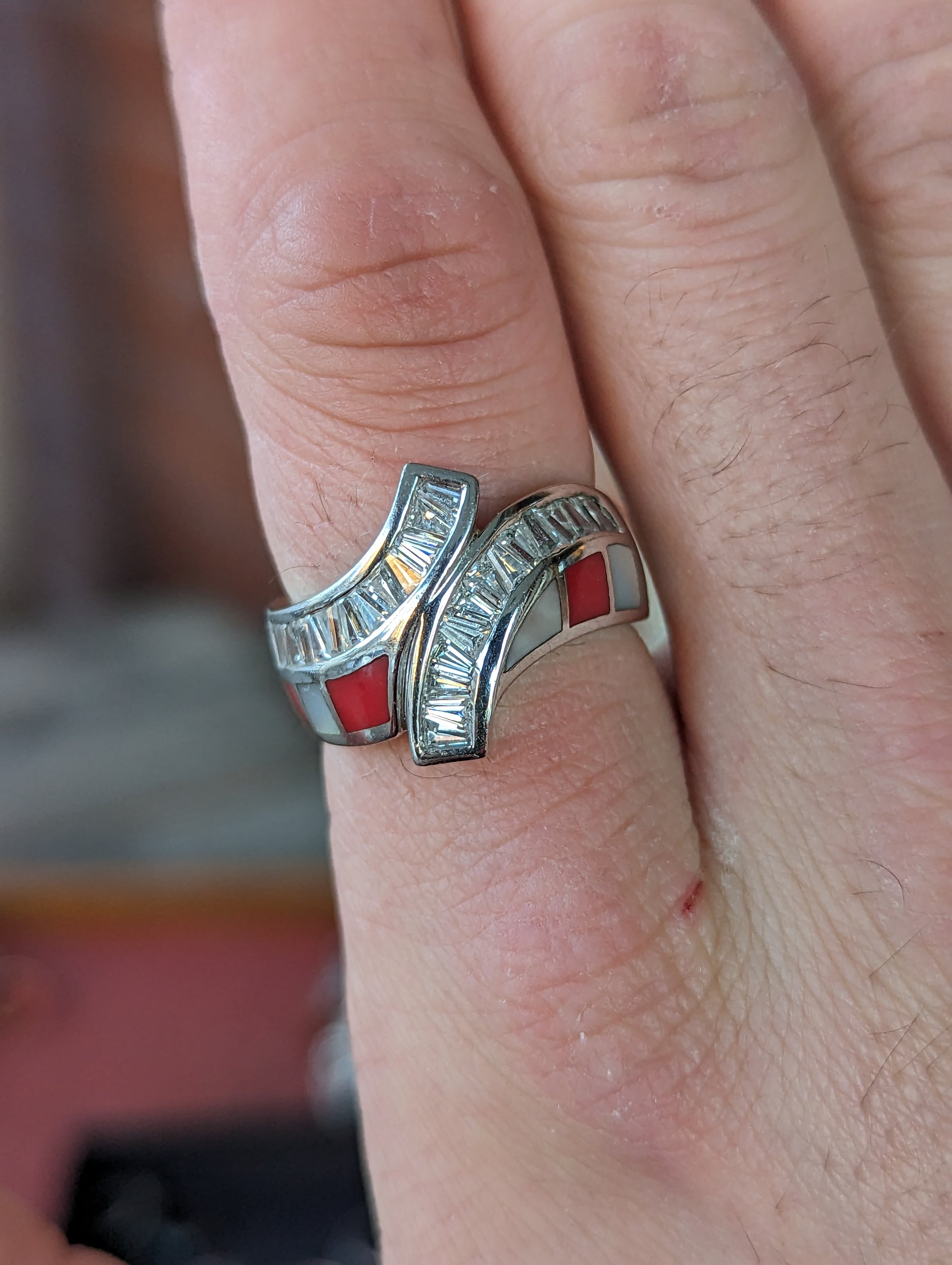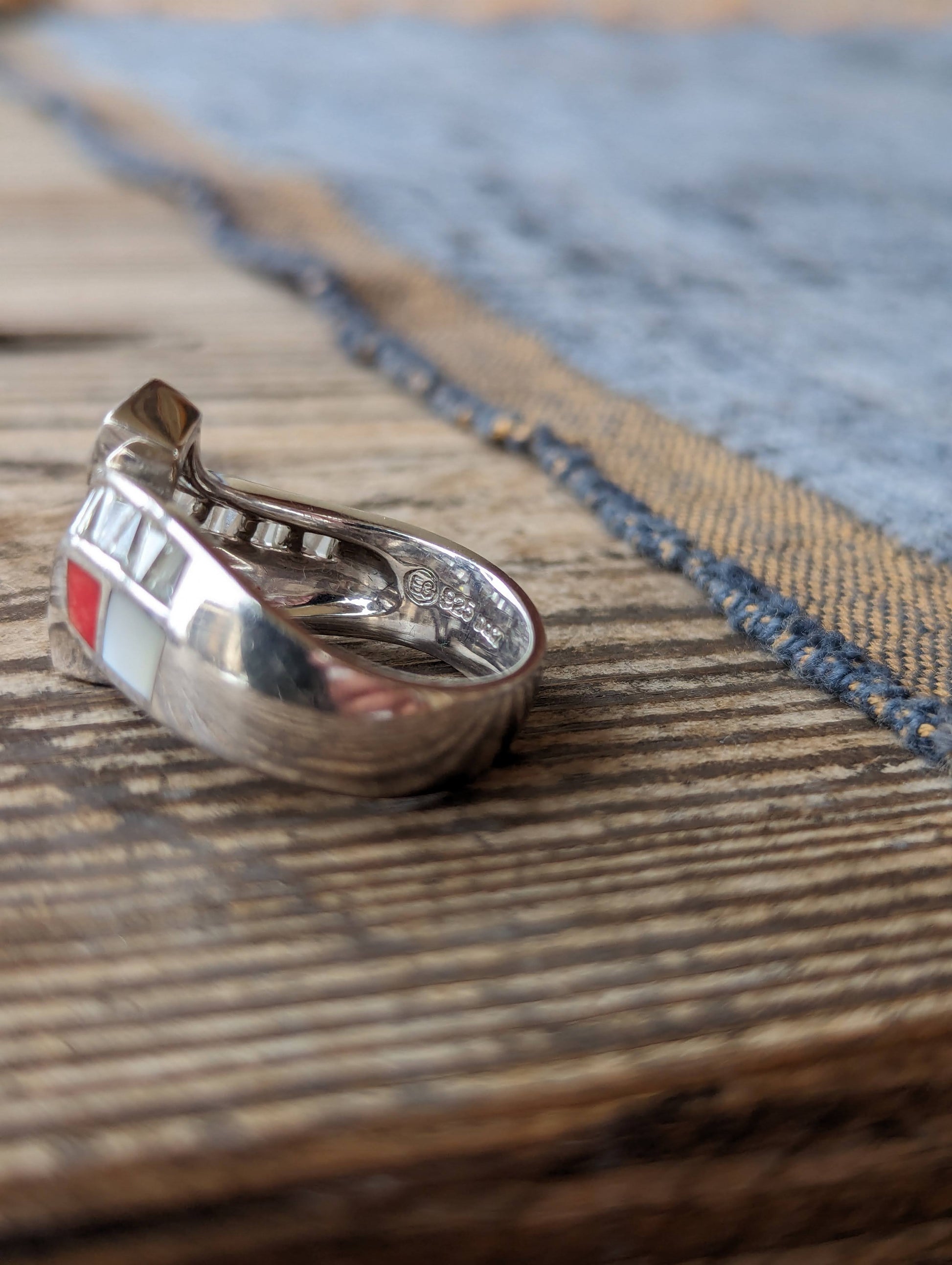 Sterling dq CZ, coral & Mother of Pearl inlaid band