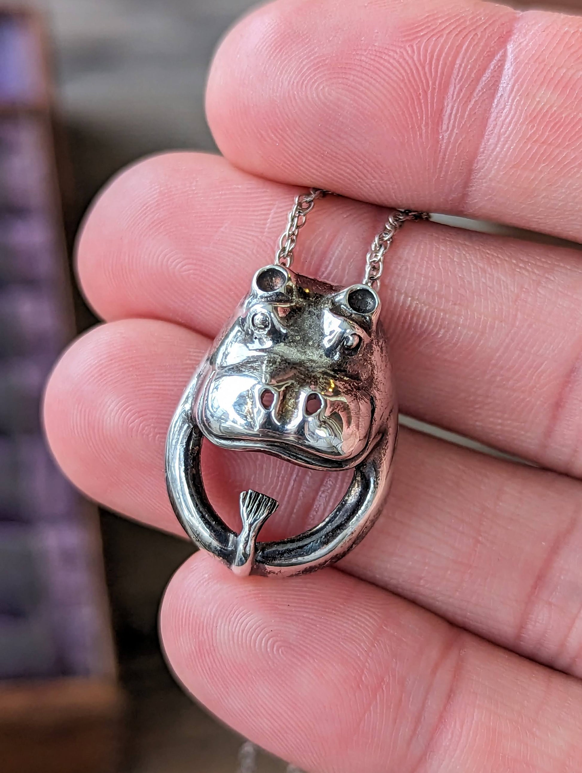 Vintage cast sterling Hippo pendant by Sigi! Flippin adorable design holding a lil grass sprig! 🦛